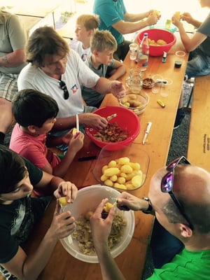 Wieder einmal fanden sich emsige Helfer (vor allem Vorstandsmitglieder) ab 0900 Uhr im Gebäude der Feuerschau in Steinegg ein. Das Geschirr, Kochtöpfe, Grillstellen und Vieles mehr wurde herangeschafft. Kartoffeln geschält, viele Büchsen mit Mais oder Bohnen geöffnet. Ja, die Salate gelangen dieses Jahr besonders gut.